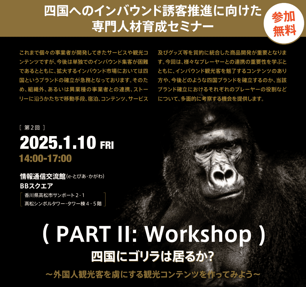 2025年1月10日、四国ツーリズム創造機構、四国経済連合会が主催する「四国へのインバウンド誘客推進に向けた専門人材育成セミナー(第2回)」に、当社代表のJun Pageが講師として登壇いたしました。2024年7月に好評を博したセミナーの第二弾として、今回はワークショップ形式で「外国人観光客を虜にする観光コンテンツ」の作成を行いました。